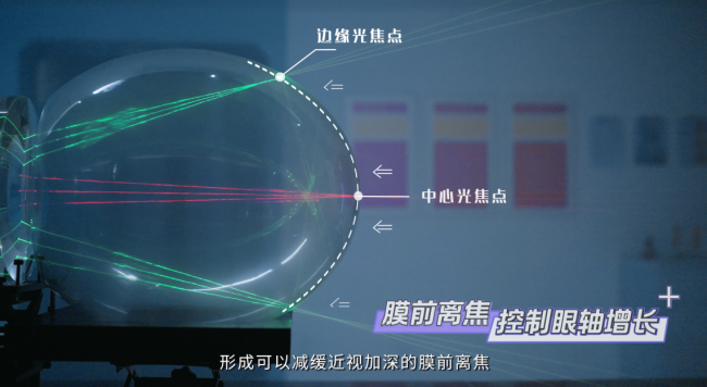 明月轻松控Pro采用多点近视离焦眼轴控制技术(C.A.M.D),在镜片内部雕刻了高达1295个正度数微透镜,使周边区域成像在视网膜前,从而形成膜前离焦。膜前离焦控制眼轴增长,延缓近视加深。