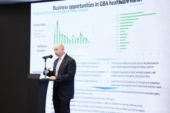 德勤中国董事Aaron Finley先生,以「新科技赋能健康产业前赡」为题,与在场人士分享有关 COVID-19 后中国生命科学和医疗保健环境,以及未来的最新情况和机会领域。