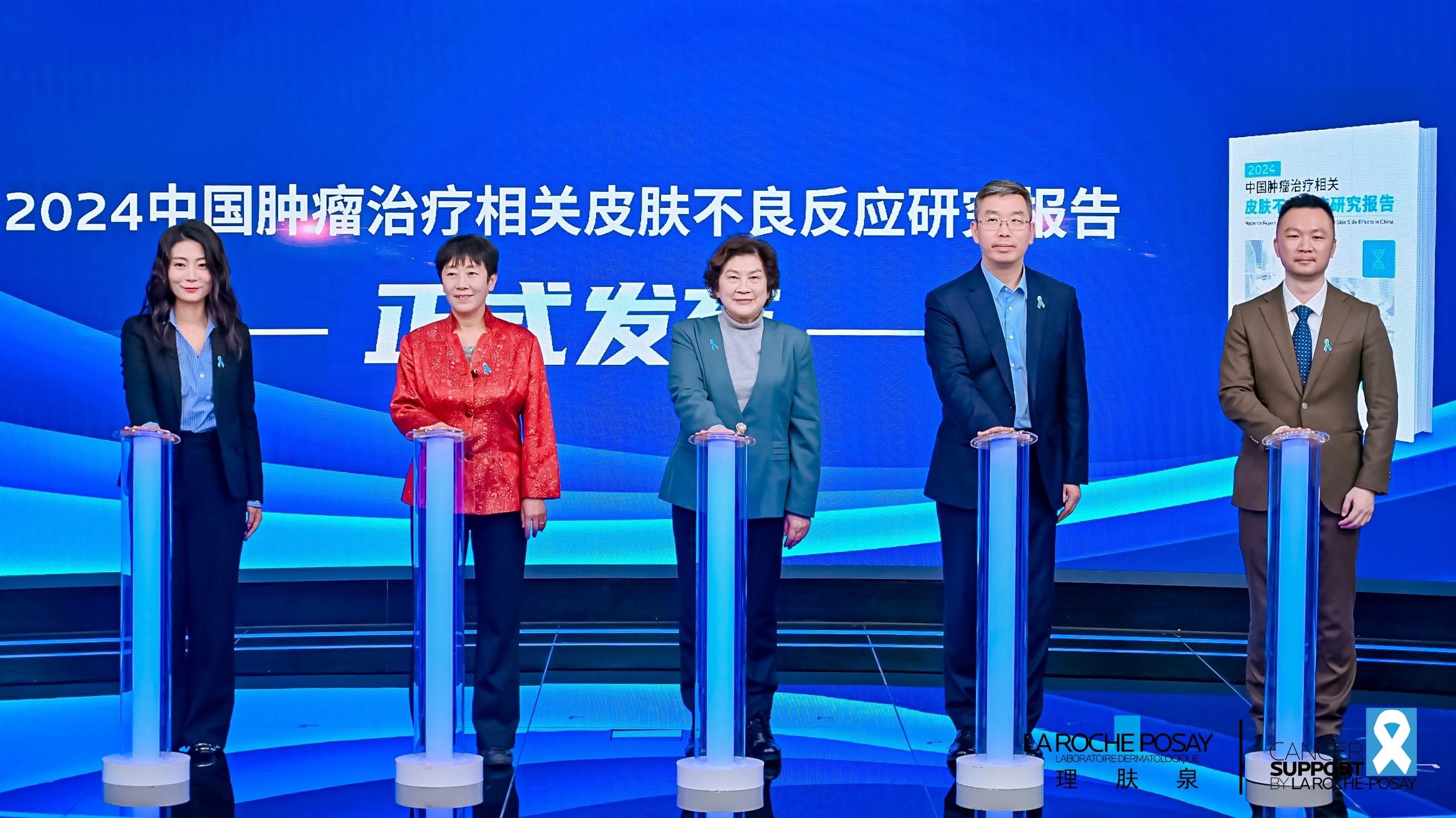 《2024中国肿瘤治疗相关皮肤不良反应研究报告》发布仪式(自左至右):理肤泉品牌总监孟颖琪女士、北京大学公共卫生学院刘民教授、北京爱谱癌症患者关爱基金会史安利理事长、中日友好医院崔勇教授、欧莱雅皮肤科学美容事业部郑一诫博士
