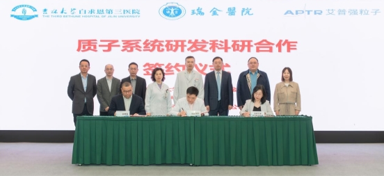 2025 年 4 月 25 日,吉林大学中日联谊医院(以下简称“吉大中日医院”)院长刘林林、副院长高宇飞、副院长刘俊志、放射治疗一病区主任程光惠等一行六人共赴上海,与上海交通大学医学院附属瑞金医院(以下简称 “瑞金医院”)、上海艾普强粒子设备有限公司举行质子系统研发科研合作框架协议签约仪式。瑞金医院院长、中国工程院院士宁光教授,医学影像先进技术研究院院长陈海涛,放射治疗科主任陈佳艺以及联和投资副总裁、艾普强董事长兼总经理孙曦东、艾普强总工程师张满洲等领导专家出席活动,三方就深化质子治疗技术临床转化、平台创新及设备应用达成战略合作共识。
